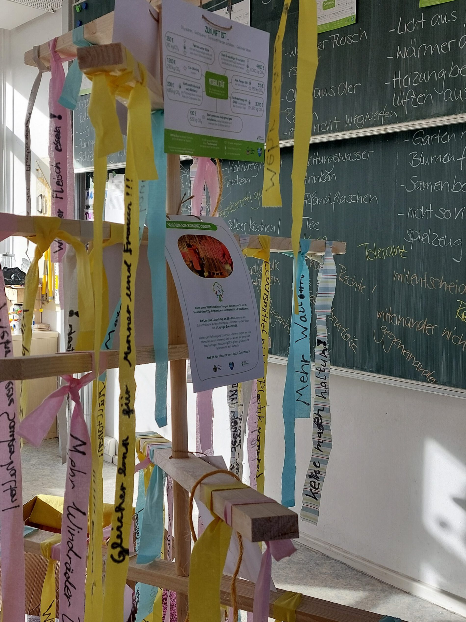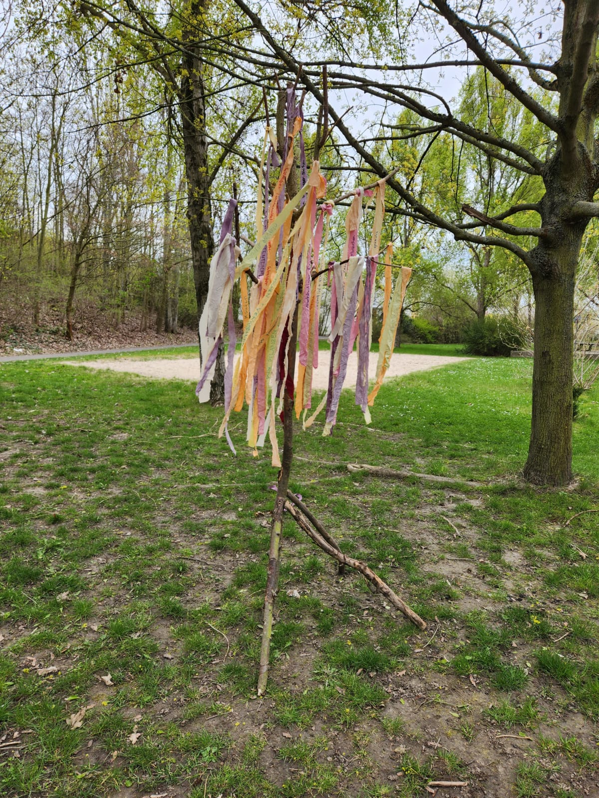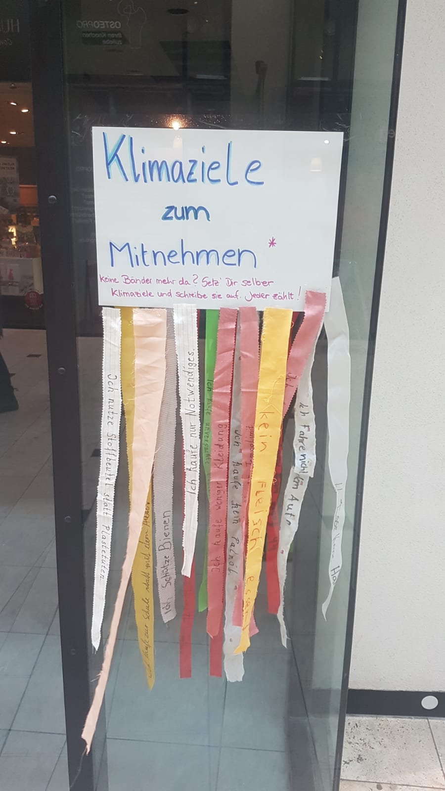 Beim ersten Zukunftswald Deutschlands: Der besteht aus etwa 100 Zukunftsbäumen, die mit 10.000 symbolischen Klimabändern als Versprechen an die Erde geschmückt sind: Was ändere ich in meinem Verhalten oder habe ich schon geändert?